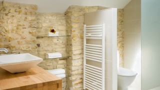 La salle d’eau privative avec mur en pierres apparentes comporte une douche à l’italienne, une vasque en pierre naturelle et toilettes. Le miroir ancien complète la décoration.
