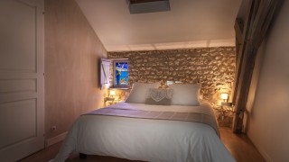 Charpente et mur en pierres apparentes sont mis en valeur dans un décor aux tons et enduits à la chaux naturels pour cette chambre spacieuse.